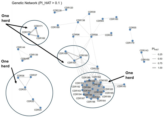 A genetic relatedness network shows that related individuals from one herd have genetically closer distances than other individuals (Figure 4). The network shows that all Waddah individuals from one herd (n = 20) clustered together, whereas five Saheli individuals clustered together (bottom right). However, six Shageh individuals were separated into two clusters.