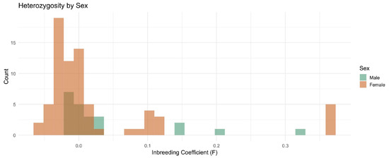 A histogram stratified by sex showed the distribution of the inbreeding coefficient F (Figure 5). Most breeds exhibit low F values, clustering around zero, indicating negligible inbreeding. However, four males and one female display higher F values approaching 0.15, signaling possible recent inbreeding. These four males and one female had infertility problems as described in the Methods section. Additionally, four females sampled from one herd had high F values. These patterns underscore the overall low level of inbreeding in the dataset but highlight specific individuals where inbreeding was elevated.