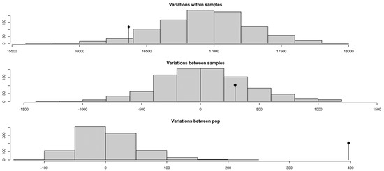 - Excoffier, L.; Smouse, P.E.; Quattro, J.M. Analysis of molecular variance inferred from metric distances among DNA haplotypes: Application to human mitochondrial DNA restriction data. Genetics 1992, 131, 479–491. [Google Scholar] [CrossRef]