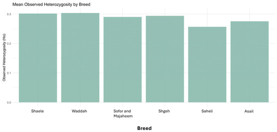 The bar charts summarizing mean observed heterozygosity () per breed showed modest variation among breeds (Figure 7). The Waddah breed exhibits the highest mean heterozygosity (0.30), closely followed by Shaele. The Saheli breed has the lowest mean heterozygosity (0.26). These differences, although statistically small, mirror the patterns seen in allelic richness, suggesting slightly higher genetic diversity in certain breeds. The overall range of heterozygosity values is narrow (0.26–0.31), consistent with the AMOVA and FST results indicating low differentiation among breeds.