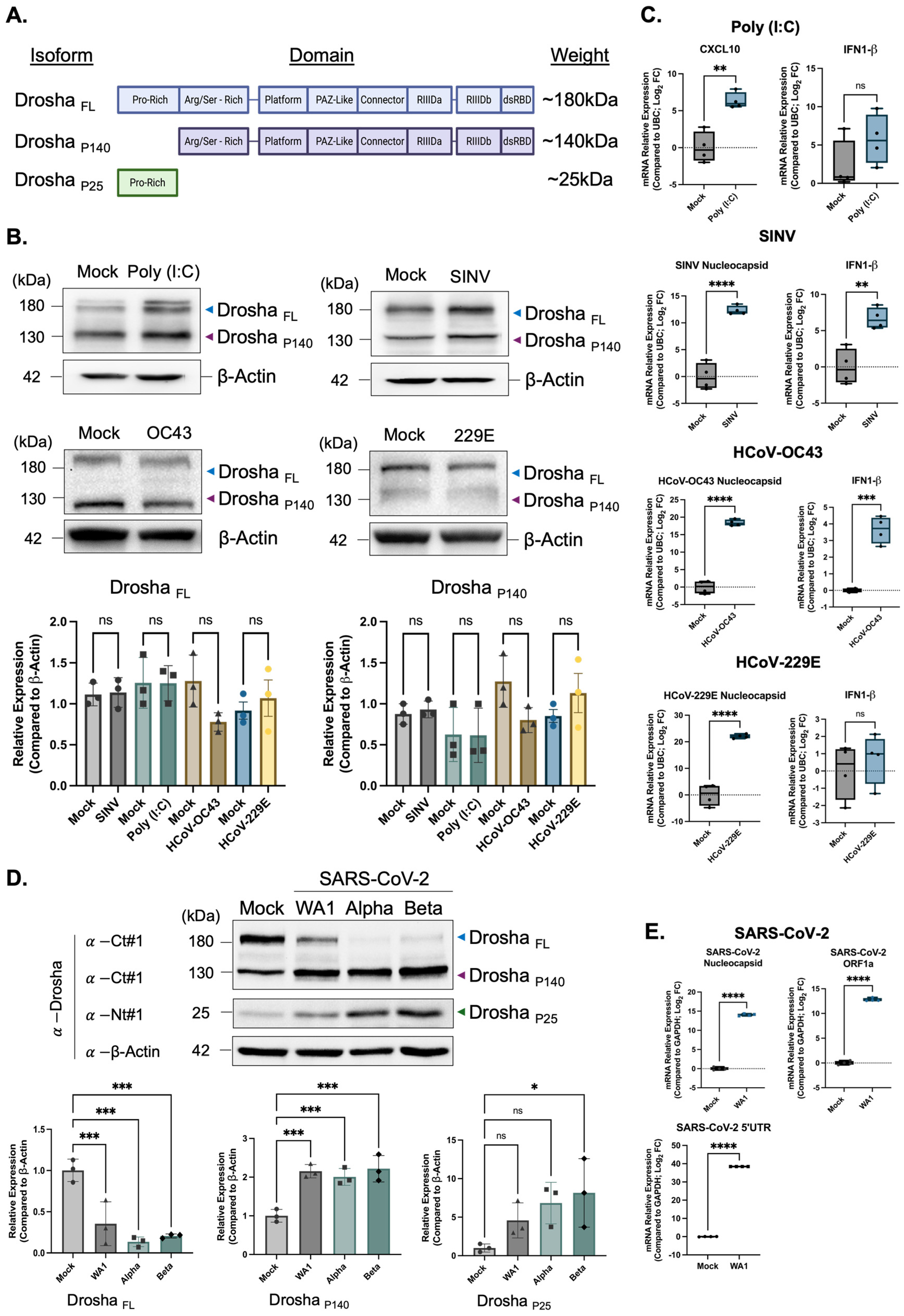 Figure 1. Drosha undergoes cleavage into smaller isoforms following infection by SARS-CoV-2 but not following treatment with poly (I:C), or infection by another positive-sense RNA virus/other non-severe human coronaviruses. (A) Schematic representation of Drosha full-length and proteolytically cleaved isoforms (P140, P25), with included domains and respective molecular weights. (B) Western blot analysis of Drosha protein isoforms in NuLi-1 cells 48 h post-treatment/infection with poly (I:C), Sindbis virus (SINV) (MOI 5.0), HCoV-229E (MOI 1.0), HCoV-OC43 (MOI 1.0). (C) Quantitative RT-PCR analysis of infected NuLi-1 cells, measuring expression of viral targets or antiviral response genes. Poly(I:C)-treated cells show elevated CXCL10 and IFN-Beta expression compared to the mock control group. Cells infected with SINV, HCoV-OC43, or HCoV-229E exhibit robust expression of viral nucleocapsid genes and IFN-β. (D) SARS-CoV-2 variants (WA1, Alpha, Beta). Representative immunoblots show full-length Drosha (FL), the P140 cleavage product, and a lower molecular weight isoform (P25), with β-actin used as a loading control. Bands corresponding to Drosha cleavage products are present following infection with each coronavirus but absent or faint in poly(I:C), SINV, HCoV-OC43, and HCoV-229E-treated/infected samples. (E) SARS-CoV-2-infected cells (WA1, Alpha, Beta) (MOI 1.0) display SARS-CoV-2 ORF1a, N gene, and 5′UTR expression. Data are normalized to Beta-Actin or GAPDH and are presented as mean fold change ± SD from at least three independent experiments. The statistical significance between groups was determined using a two-tailed Student’s t test, or two-way ANOVA followed by Tukey’s post hoc test (ns, not significant; * p < 0.05; ** p < 0.01; *** p < 0.001; **** p < 0.0001).
