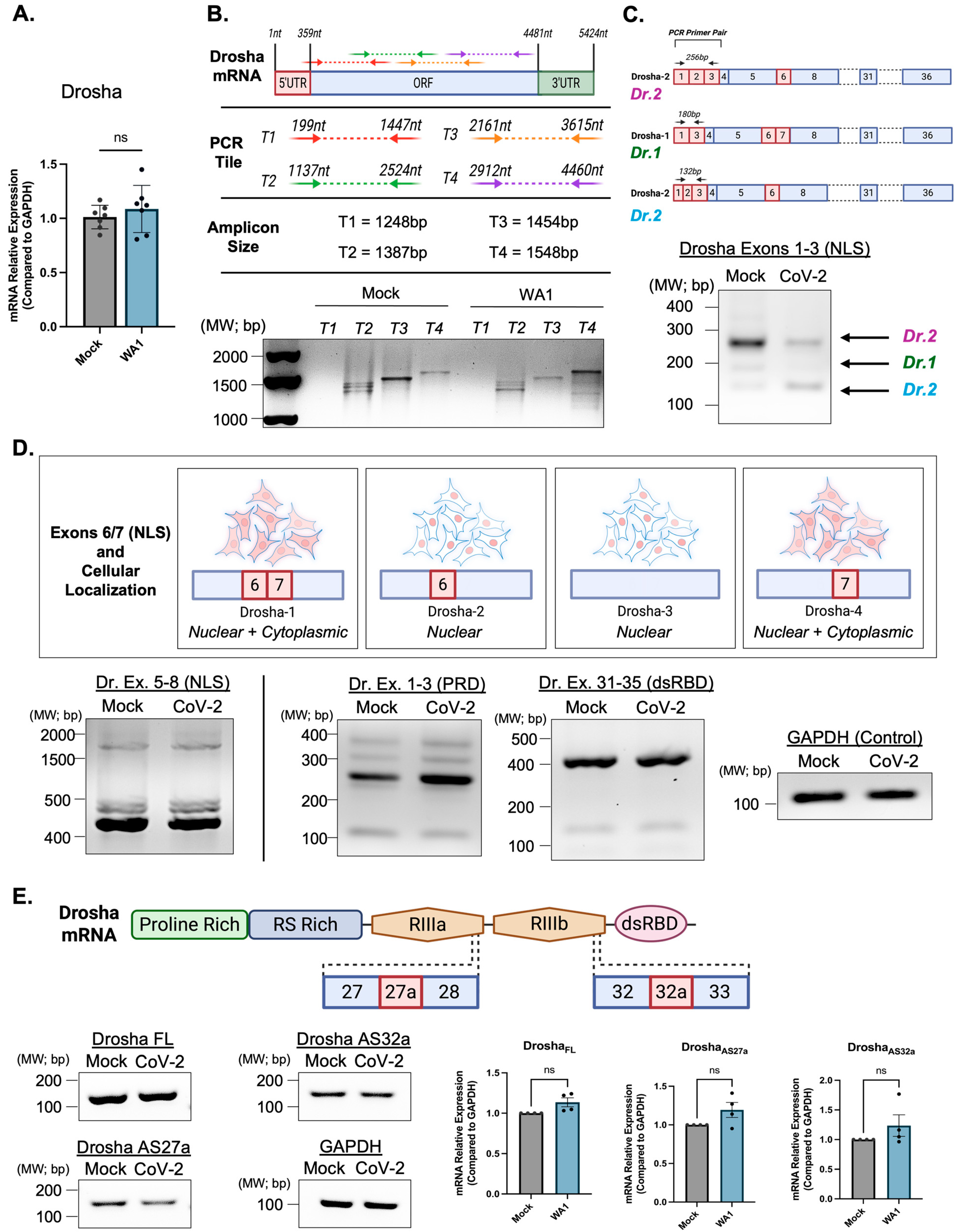 Figure 2. Drosha splice variant expression is largely unaltered at the transcript level following SARS-CoV-2 infection. (A) qRT-PCR shows no significant change in the expression of Drosha at the mRNA transcript level. (B) Agarose gel electrophoresis showing amplification of overlapping tiled regions spanning the full-length Drosha transcript (Tiles 2–4) in mock and SARS-CoV-2-infected NuLi-1 cells. No major differences in band intensity or size were observed, suggesting stable global Drosha transcript expression following infection. (C) Exon 1-3 amplification relating to exon 6/7 retention. Following SARS-CoV-2 infection, there is no clear trend in the loss or retention of exon 6, relating to the nuclear localization of Drosha. (D) RT-PCR analysis of Drosha exon groups in mock- and SARS-CoV-2 WA1-infected NuLi-1 cells. Primer sets targeted exon regions 1–3, 5–8, and 31–35. PCR products show comparable size and intensity across conditions, indicating no large-scale exon exclusion or inclusion. GAPDH amplification was included as a loading and cDNA quality control. (E) qRT-PCR analysis of potential intron retention events between exons 27/28 and 32/33 of the Drosha transcript. Minor band shifts were observed but did not indicate strong intron retention following infection. GAPDH amplification was included as a loading and cDNA quality control. Data are shown as mean ± SD of at least three biological replicates. The statistical significance between groups was determined using a two-tailed Student’s t-test (ns, not significant). Molecular weight markers are shown in base pairs (bp). Graphical figures were created using BioRender.com.