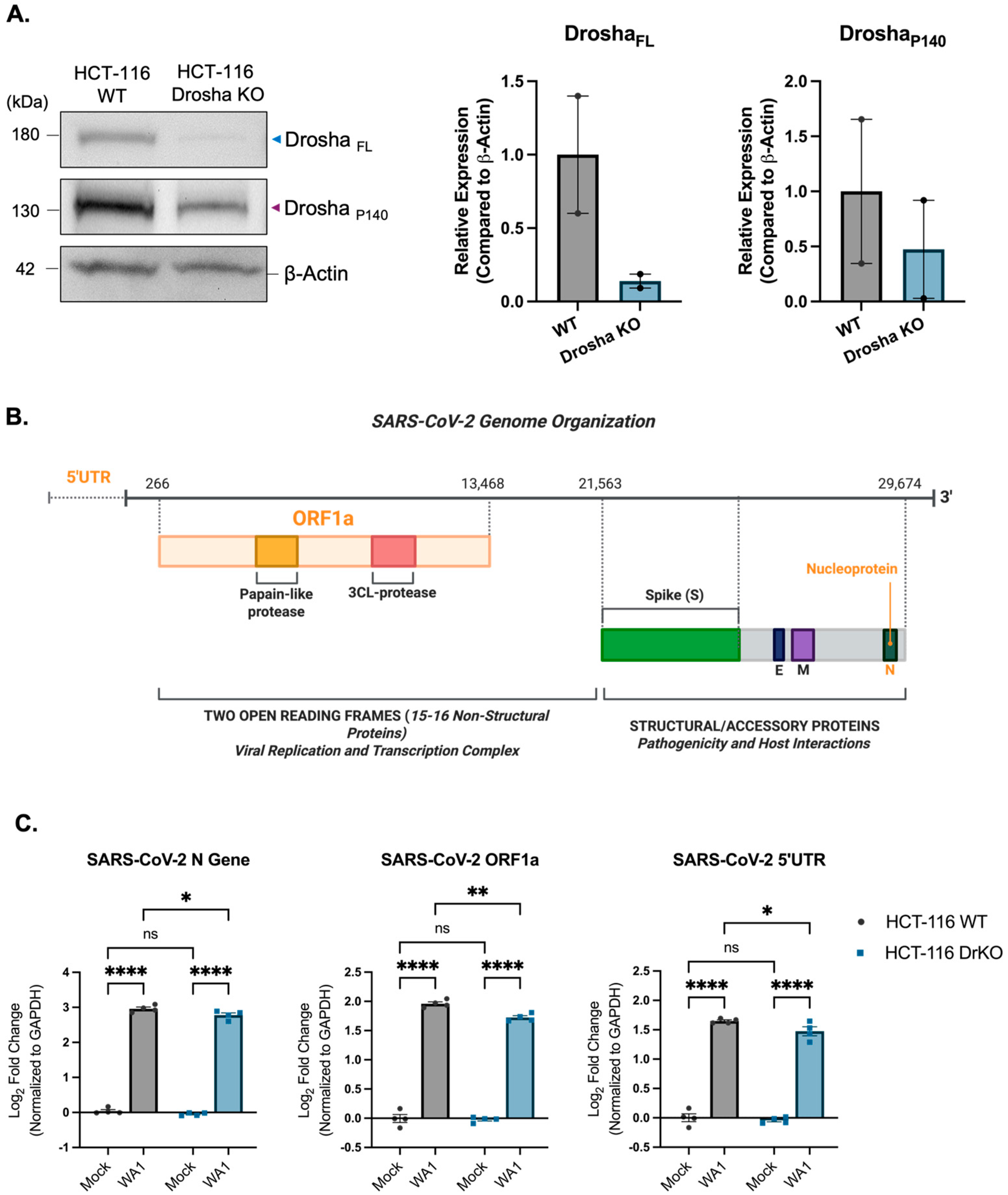Figure 4. Drosha knockout leads to a decrease in the expression of SARS-CoV-2 genomic and sub-genomic RNA. (A) Representative Western blot image and analysis of full-length and P140 Drosha expression in HCT-116 wild-type (WT) and Drosha knockout (DrKO) cells. Data are normalized to Beta-Actin and are presented as mean fold change ± SD of two biological replicates. (B) Diagram of SARS-CoV-2 genome organization, with qPCR gene targets highlighted in orange. (C) Quantitative RT-PCR analysis of SARS-CoV-2 replication markers in HCT-116 WT and HCT-116 DrKO cells 48 h post-infection with SARS-CoV-2 WA1 (MOI 1.0). Transcript levels for Nucleocapsid (N), ORF1a, and 5′UTR regions show a significant decrease in expression, following SARS-CoV-2 infection, in Drosha knockout cells compared to WT. Data shown are normalized to GAPDH and are presented as mean fold change ± SD from three biological replicates. The statistical significance between groups was determined by using a two-way ANOVA followed by Tukey’s post hoc test (ns, not significant; * p < 0.05; ** p < 0.01; **** p < 0.0001). Graphical figures were created using BioRender.com.