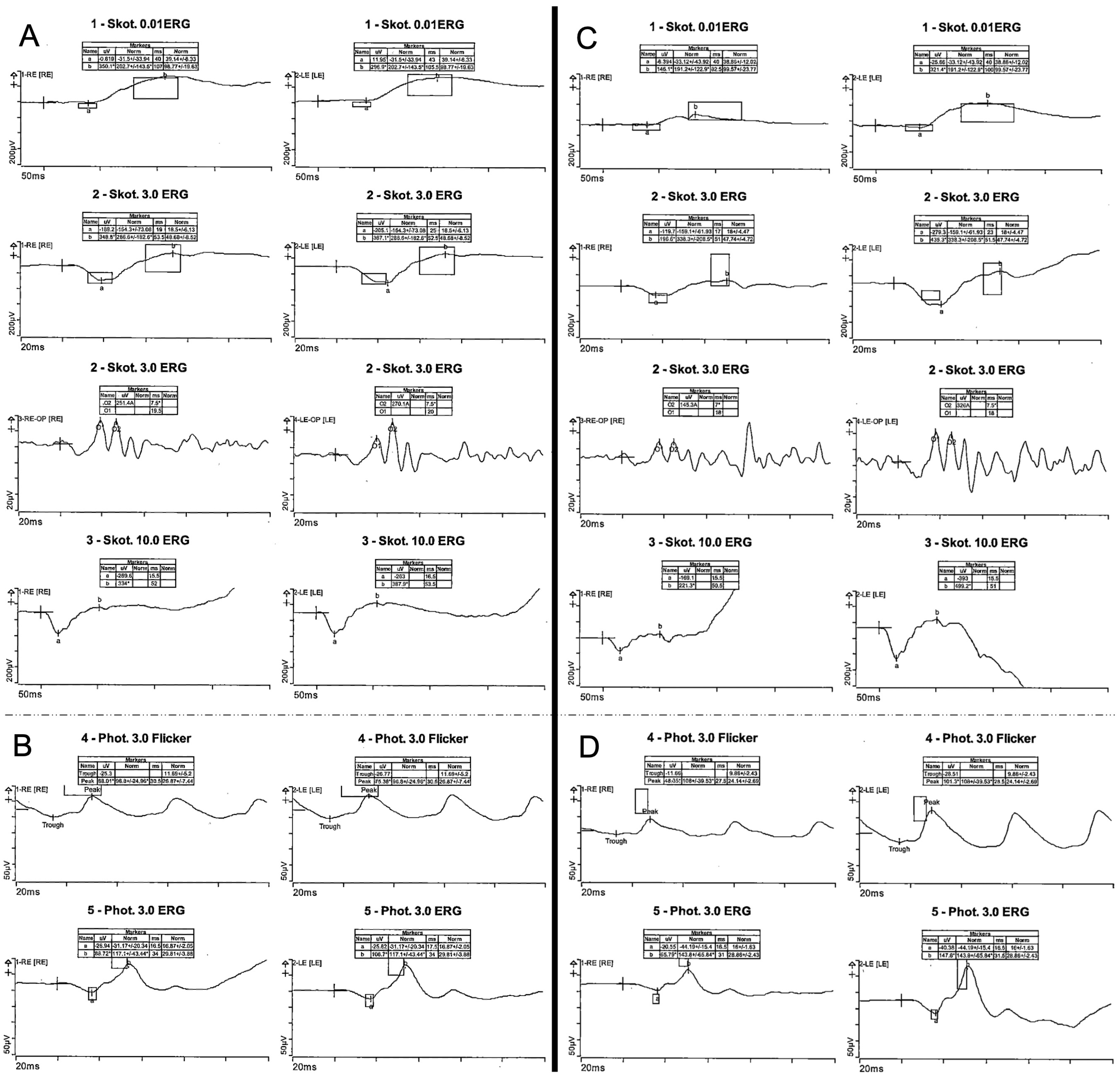 Figure 2. Electrophysiology testing. Full-field electrophysiology testing (ERG) of a 67-year-old index patient (III:5) with normal scotopic (A) and photopic (B) responses and ERG of her 39-year-old son (IV:1) with normal scotopic (C) and pathologic photopic (D) responses with reduced amplitudes.