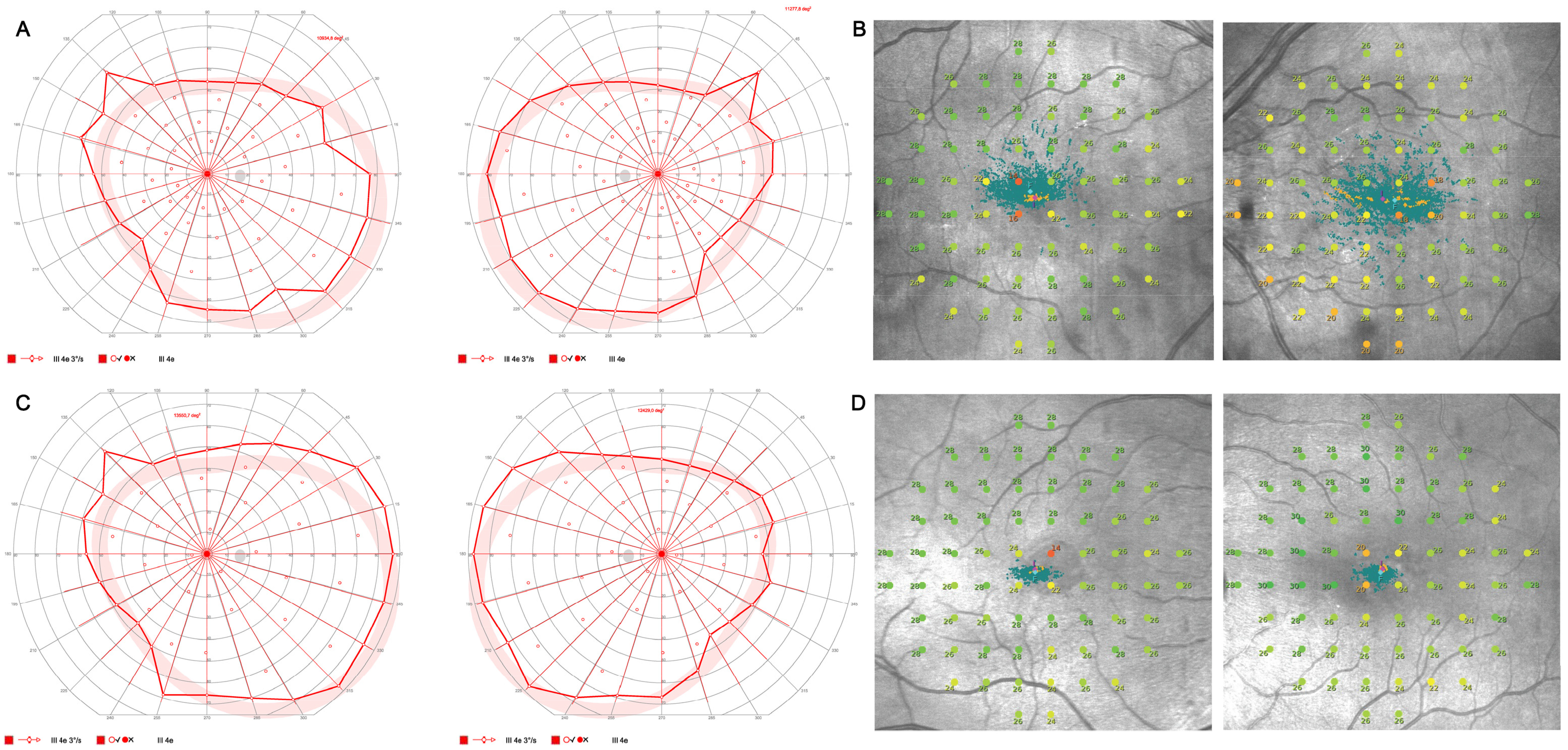 Figure 3. Visual field testing. Visual field testing with normal outer visual field borders (bilateral 80° temporal, 60° nasal, 45° superior, 65° inferior) in Octopus 900 (III 4e) (A) and central restriction with decreased fixation stability (Fixation loss right eye (OD) 14%, left eye (OS) 25%) on mesopic microperimetry (B) of a 67-year-old index patient (III:5) and visual field testing of her son (IV:1) with normal outer visual field borders (bilateral 90° temporal, 55° nasal, 45° superior, and 65° inferior) in Octopus 900 (III 4e) (C) and mild central restriction with preserved fixation stability (Fixation loss bilateral 0%) on mesopic microperimetry (D).