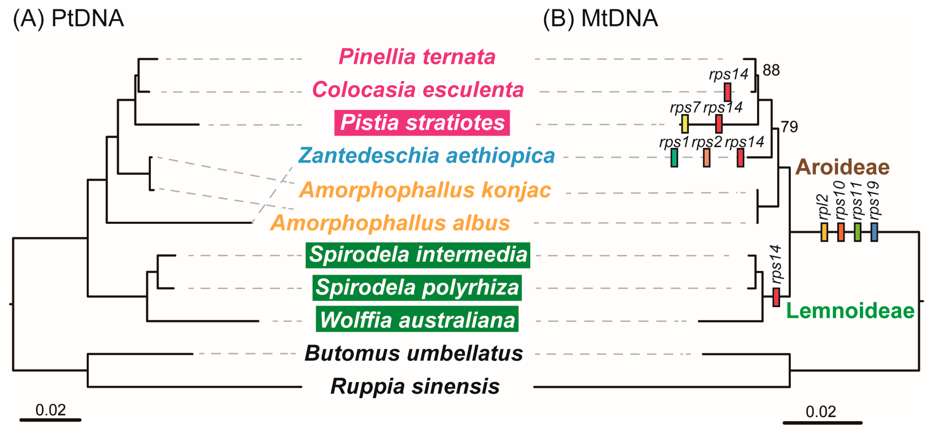 - Wang, W.; Wu, Y.; Messing, J. The mitochondrial genome of an aquatic plant, Spirodela polyrhiza. PLoS ONE 2012, 7, e46747. [Google Scholar] [CrossRef] [PubMed]