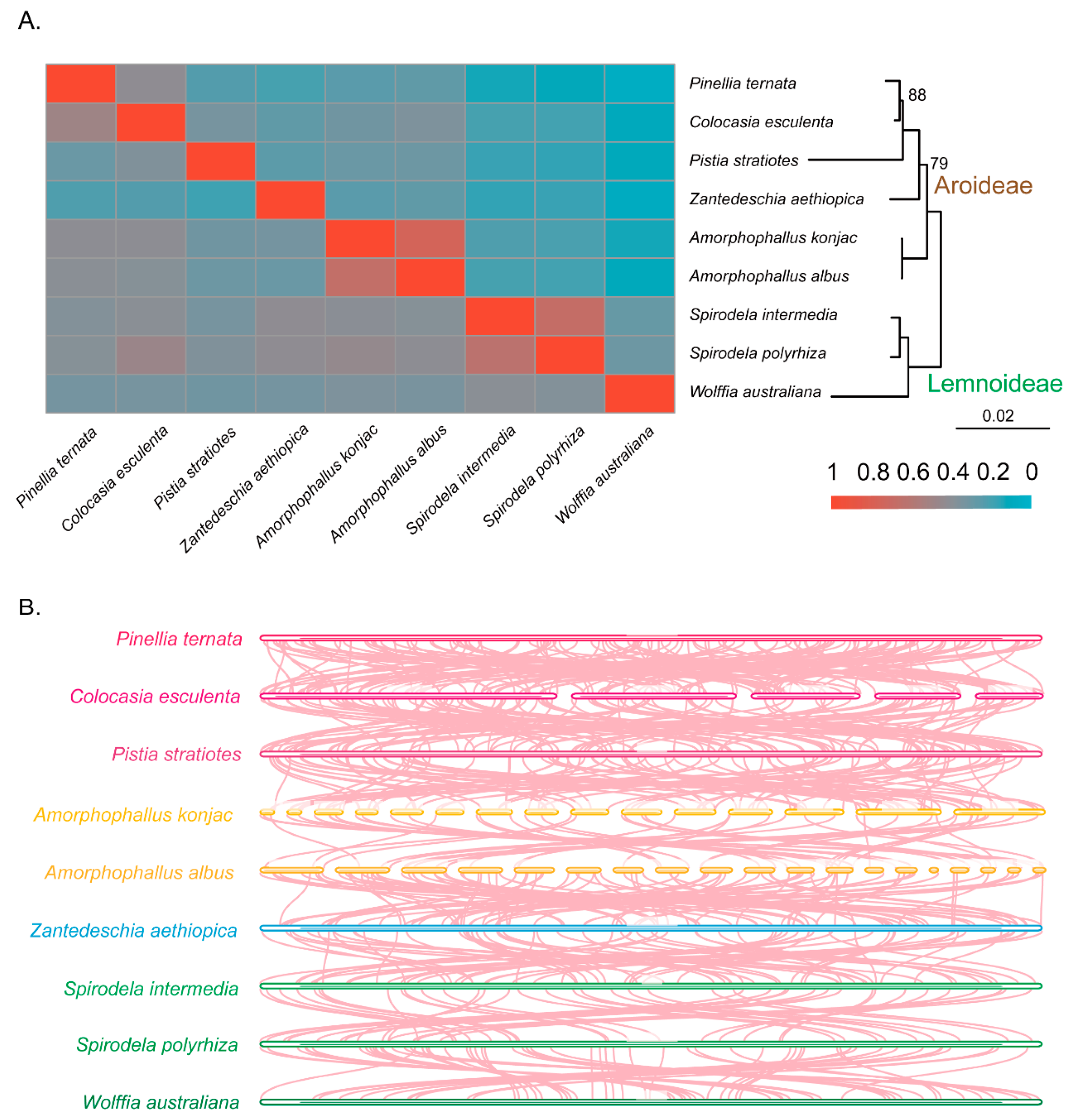 - Qian, Z.; Li, Y.; Yang, J.; Shi, T.; Li, Z.; Chen, J. The chromosome-level genome of a free-floating aquatic weed Pistia stratiotes provides insights into its rapid invasion. Mol. Ecol. Resour. 2022, 22, 2732–2743. [Google Scholar] [CrossRef] [PubMed]