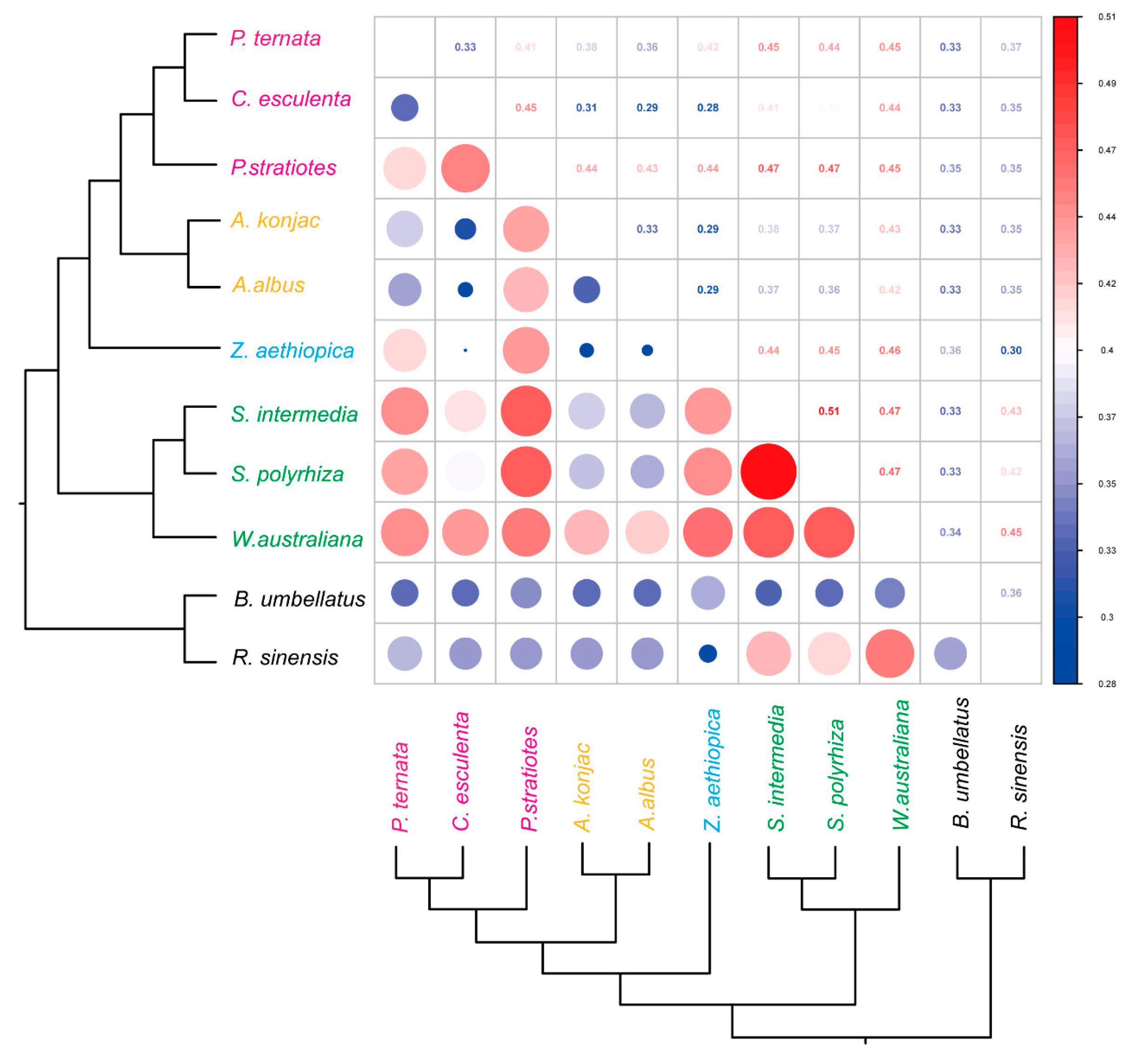 | Colocasia esculenta | Pistia stratiotes | Amorphophallus konjac | Spirodela polyrhiza | Wolffia australiana | ||