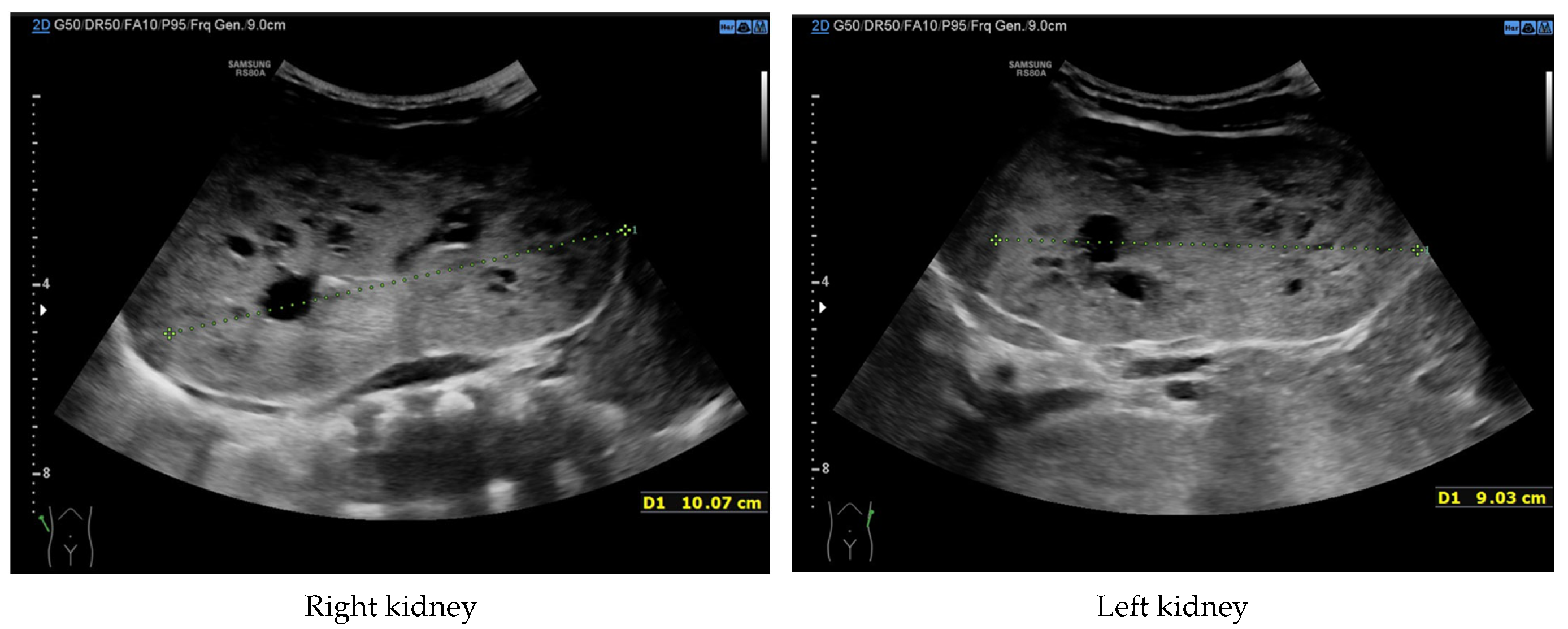 At 4 months of age, the boy was admitted to the hospital due to a hypertensive crisis (BP 162/128 mmHg). Chest X-ray demonstrated cardiomegaly, and echocardiography (ECHO) showed a significant left ventricular hypertrophy and impaired contractility. Abdominal US detected increased kidneys length (right: 101 mm (z-score 8.72); left: 90 mm (z-score 6.59)), with increased echogenicity and loss of corticomedullary differentiation, as well as numerous cysts 5–6 mm in diameter. The liver was enlarged with increased echogenicity with cysts 6–8 mm in diameter (