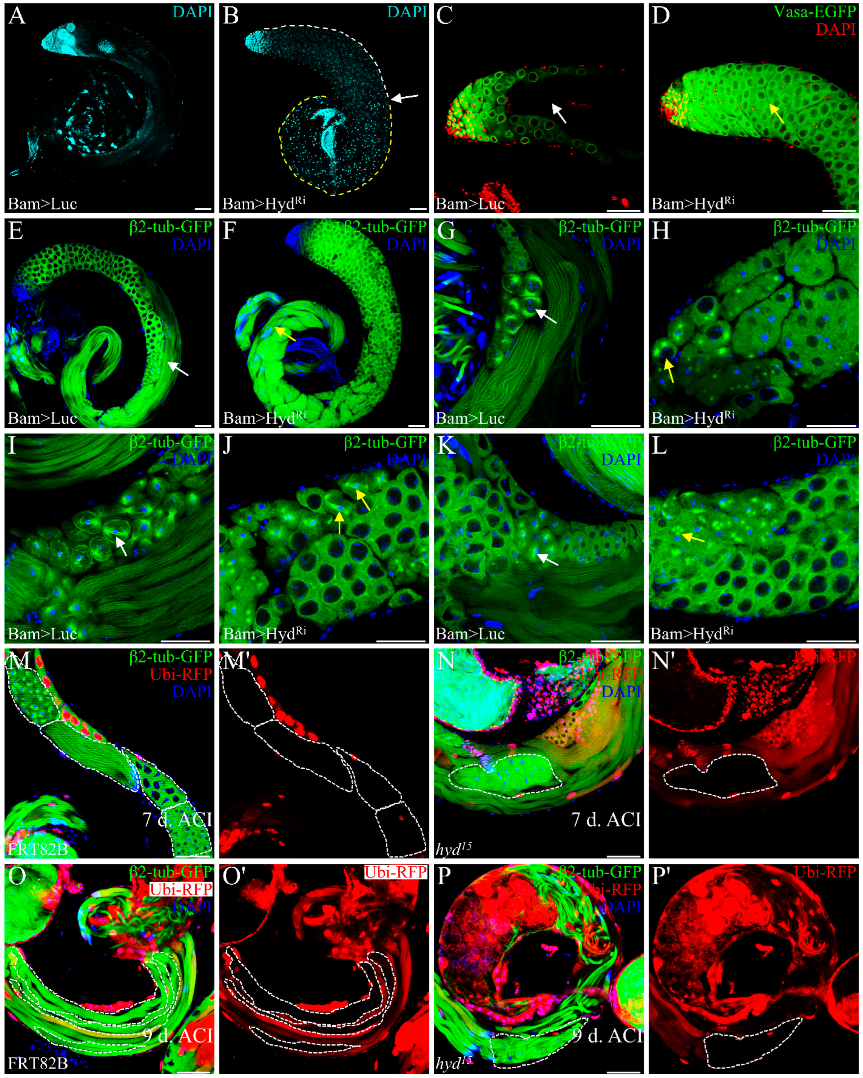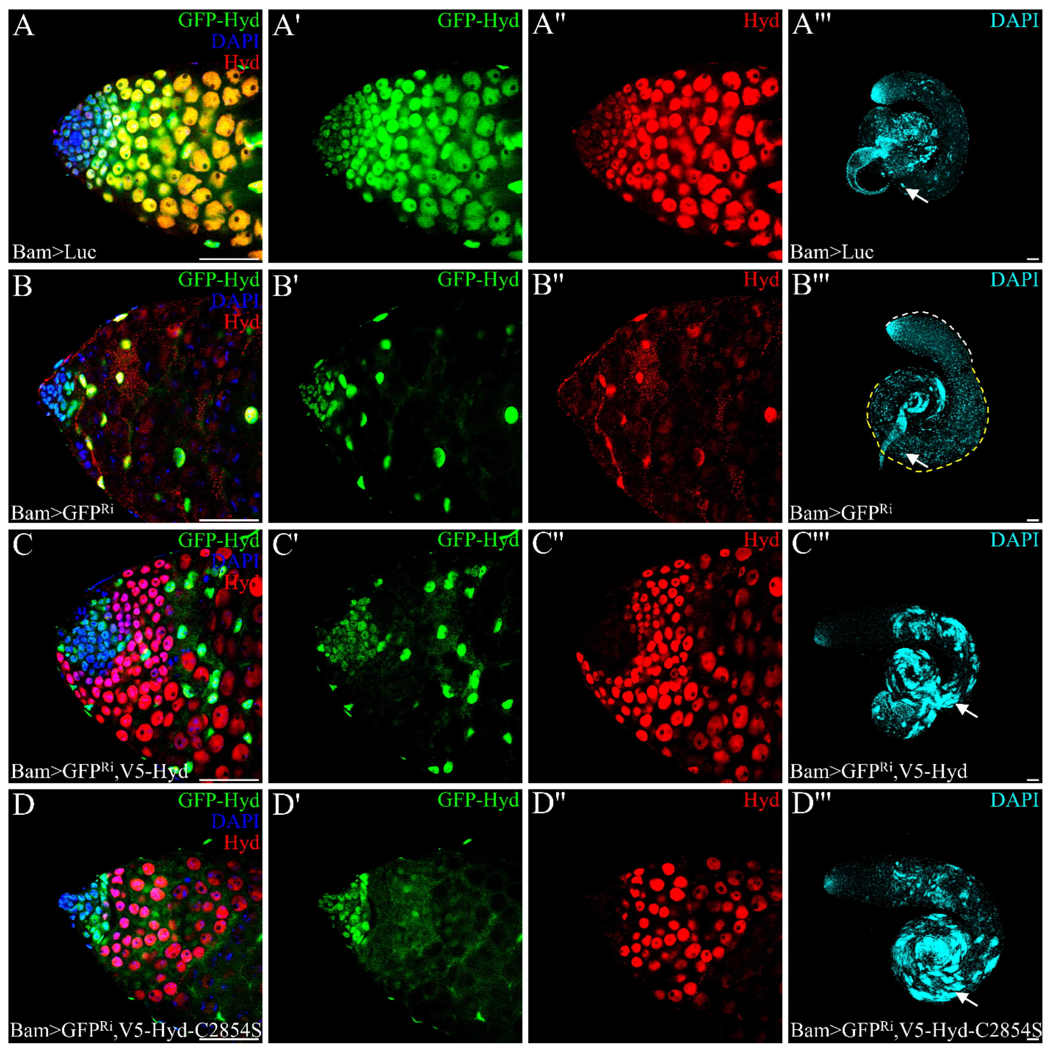 3.3. Hyd Regulates Germ Cell Differentiation Independently of Its E3 Ubiquitin Ligase Activity