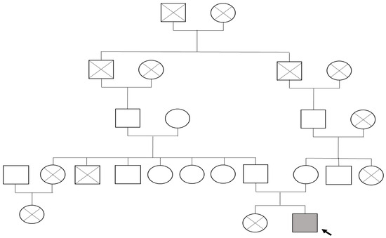 Family tree of proband with FBLN5-related cutis laxa type 1A: The proband (indicated by the black arrow) is represented by a shaded square (male) affected by autosomal recessive FBLN5-associated cutis laxa type 1A. Circles denote females, squares denote males, and diagonal lines indicate deceased individuals.