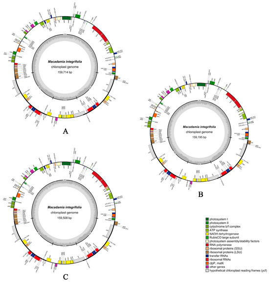 Chloroplast genome maps of the three Macadamia integrifolia cultivars. (A) Guilin No. 1, (B) Nanya No. 1, and (C) Qian’ao No. 1.