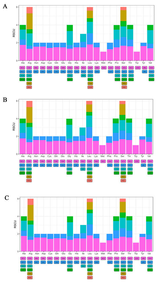 The relative usage degree of codons in the chloroplast genomes of three Macadamia integrifolia cultivars. (A) Guilin No. 1, (B) Nanya No. 1, and (C) Qian’ao No. 1.