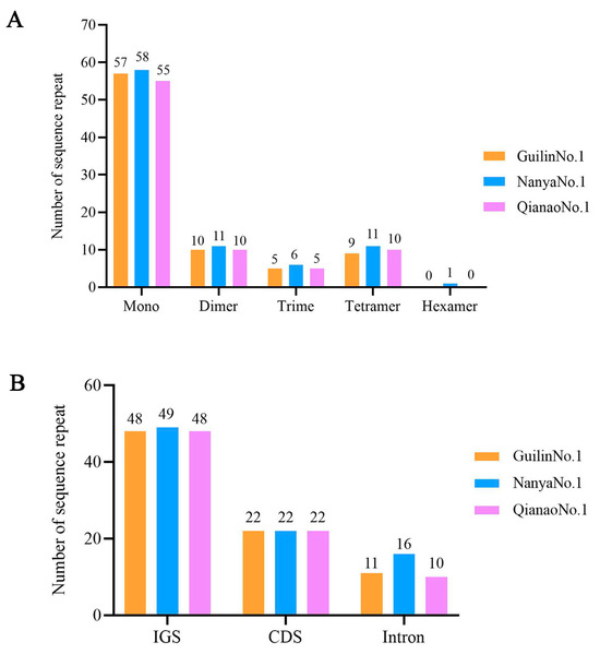 Simple sequence repeats (SSRs), a type of tandem repeat sequence typically no longer than 6 bp, are widely used in molecular marker development due to their dominant inheritance. In this study, a total of 81, 87, and 80 SSRs were detected in the chloroplast genomes of the three M. integrifolia cultivars (Guilin No. 1, Nanya No. 1, and Qian’ao No. 1), respectively. Among them, there were 57, 58, and 55 mononucleotides, 10, 11, and 10 dinucleotides, 5, 6, and 5 trinucleotides, and 9, 11, and 10 tetranucleotides, respectively. Additionally, a single hexanucleotide was identified in Nanya No.1 (Figure 3A and Table S2). Notably, SSRs in all three M. integrifolia cultivars were predominantly composed of mononucleotide repeats (A/T), followed by dinucleotide repeats (Figure 3A and Table S3). These SSRs were primarily concentrated in the LSC region, accounting for approximately 77.78% of the total, followed by the SSC region (14.81%), and finally the IR regions (7.40%). Regarding distribution locations, among the SSRs in the three M. integrifolia cultivars, 48, 49, and 48 were located in intergenic spacers (IGS), 22, 22, and 22 were in coding regions (CDS), and 11, 16, and 10 were in intron regions (Figure 3B).