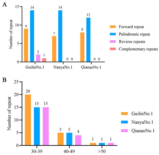 Additionally, this study employed REPuter to analyze long repetitive sequences in the chloroplast genomes of the three M. integrifolia cultivars. The results revealed the presence of 26, 21, and 20 long repeat sequences in Guilin No. 1, Nanya No. 1, and Qian’ao No. 1, respectively. Among these, 9, 7, and 8 were forward repeats; 14, 14, and 12 were palindromic repeats; 2, 0, and 0 were reverse repeats; and 1, 0, and 0 were complementary repeats (Figure 4A). The length distribution of the repeat sequences predominantly ranged from 30 to 39 bp (Figure 4B), primarily located in the LSC and IR regions (Table S4).