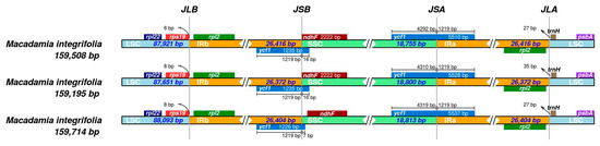 Analysis of the IR boundary changes in the chloroplast genomes of the three Macadamia integrifolia cultivars.