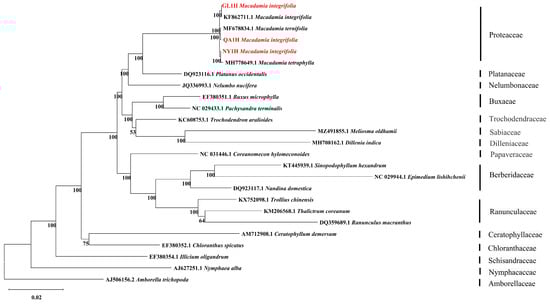 A phylogenetic tree was constructed using maximum likelihood (ML) methods, with 24 typical early diverging eudicots as the inner group and Amborella trichopod from the Amborellaceae as the outgroup (Figure 6). The results indicated that the three M. integrifolia cultivars (Guilin No. 1, Nanya No. 1, and Qian’ao No. 1) were closely related to M. integrifolia, M. tetraphylla, and M. ternifolia, respectively. These six species clustered into a small branch within Proteaceae and formed a sister clade with Platanus occidentalis from the Platanaceae family at 100% support.