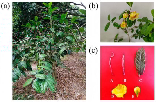 C. nitidissima plants were cultivated at the nursery of Yulin Normal University, Guangxi, China (22Β°40β²58β³ N, 110Β°11β²27β³ E). The nursery is situated in a temperate climate zone, with an average annual temperature of approximately 22 Β°C and abundant rainfall averaging 1650 mm per year. The soil is classified as red laterite. C. nitidissima is grown under a broad-leaved plantation with about 50% canopy cover. The plants, 8 years old, exhibit vigorous growth and are currently in their prime flowering phase. Various tissues, including roots, stems, leaves, flower buds, and fully bloomed flowers, were collected in triplicate (Figure 1). Immediately after collection, the samples were flash-frozen in liquid nitrogen and stored at β70 Β°C in an ultra-low temperature freezer for later analysis.