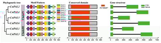 Illustrates the evolutionary relationships, conserved motifs, protein domains, and gene structures of the CnPAL gene family. In the depiction of protein conserved structural domains, gray boxes denote non-conserved domains, while red boxes signify PAL protein conserved domains. In the gene structure of the CnPALs, green boxes represent exons, and black lines indicate introns.
