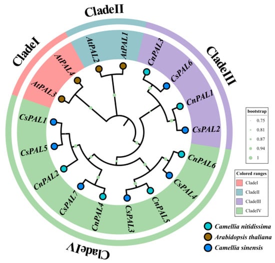 Phylogenetic tree of the PAL family proteins in C. nitidissima, A. thaliana, and C. sinensis. Phylogenetic trees were constructed via Maximum Likelihood (ML) in MEGA12 with 1000 bootstrap replications.