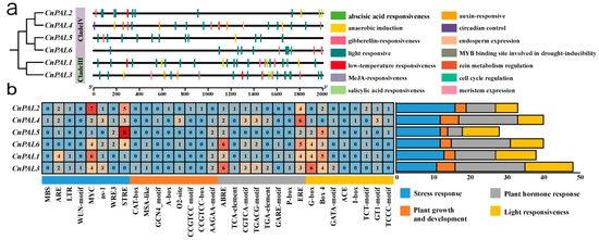 Analysis of cis-acting element in the promoter region of CnPAL genes in C. nitidissima. (a) Types and distribution of cis-acting element in the CnPALs promoter. (b) Statistical analysis of various cis-acting elements types in the CnPALs. Each box displays the number of cis-acting elements, with color intensity indicating the number of promoters.