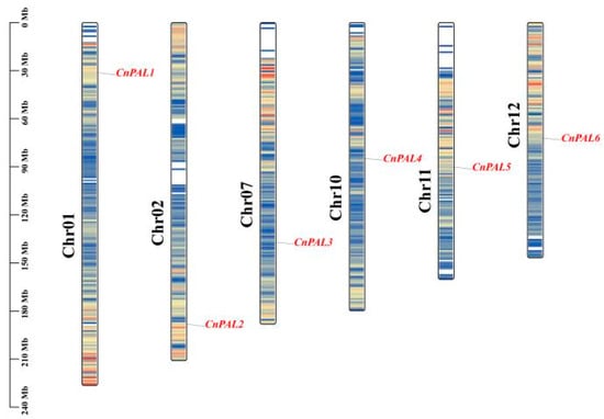 Chromosomal localization map of the PAL gene family in C. nitidissima. The elongated structure depicts chromosomes, with chromosome numbers shown in black on the left. The names of the PLA genes are highlighted in red font on the right side. The scale bar on the left indicates the chromosome length in millions of bases (Mb).