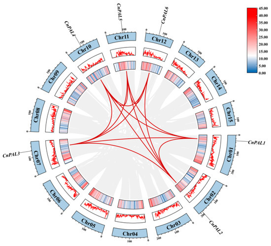 Intraspecific collinearity analysis of the CnPALs. The outer circular track represents 15 chromosomal-level scaffolds (Chr01-Chr15), while the inner circular track indicates gene density ranging from 0 to 45. The red lines represent collinear gene pairs of the CnPALs.