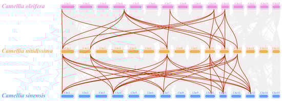 Interspecific collinearity analysis of the PAL genes among C. nitidissima, C. sinensis and C. oleifera. Gray lines indicate collinear blocks between the genomes of C. nitidissima and C. sinensis, as well as C. nitidissima and C. oleifera. Red lines represent collinearity of PAL gene pairs between the genomes of C. nitidissima with C. sinensis and C. nitidissima with C. oleifera.