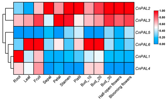 Heatmap showing the expression levels of the CnPAL genes in different tissues. The data have been standardized with the Z-score method, and row-wise clustering has been applied. Bud_10, bud_20, and bud_30 refer to flower buds measuring 10, 20, and 30 mm in length, respectively.