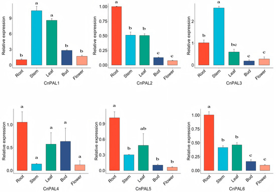 Relative expressions of CnPALs in different cultures by qRT-PCR. Data are mean Β± SE from three independent biological replicates. Different letters indicate significant differences at p < 0.05 by one-way ANOVA test.