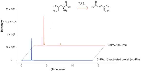 The CnPAL1 gene from C. nitidissima was successfully cloned via reverse transcription-polymerase chain reaction (RT-PCR) (Figure S1). This cloned gene was then inserted into a prokaryotic expression vector (pDEST-17) and heterologously expressed in Escherichia coli BL21 cells. The recombinant protein was subsequently purified (Figure S2). Enzymatic activity assays involved incubating the purified CnPAL1 protein (experimental group) and heat-inactivated CnPAL1 protein (control group) with reaction substrates and buffers at 30 Β°C for 1 h. UPLC-MS/MS analysis demonstrated that the experimental group produced novel reaction products. This confirmed that the CnPAL1 protein from C. nitidissima exhibited catalytic activity, efficiently converting L-phenylalanine to trans-cinnamic acid (Figure 10).