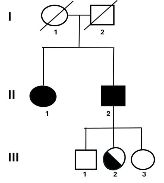 The propositus of the family was an 18-year-old female presenting an atypical reaction to anesthesia. At the age of 5 years old, the patient underwent a surgical correction of an elbow fracture and presented hyperthermia and muscle rigidity during the anesthesia, with complete reversal of symptoms after interruption of the procedure and administration of dantrolene. The in vitro contracture test (IVCT), according to the EMHG criteria, was performed, displaying a positive reaction for both halothane and caffeine (MHShc), with contracture of 0.64 g in response to 2% halothane and 0.32 g to 2 mM caffeine. Subsequently, her brother opted to also be evaluated. At the age of 25 years old, he was subjected to a muscle biopsy and IVCT, which also showed positive reaction -MHShc—contracture of 1.12 g in response to 2% halothane and 0.32 g to 2 mM caffeine—supporting the diagnosis of MH. The pedigree of the family is shown in Figure 1.