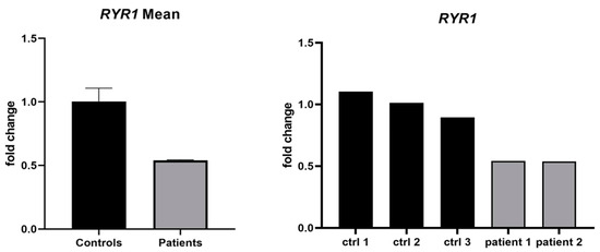 To assess gene expression, total RNA was isolated from muscle biopsy samples obtained from both patients and control individuals. RNA extraction was performed using the TRIzol™ Reagent (Invitrogen, Carlsbad, CA, USA), following the protocol provided by the manufacturer. RNA concentration and purity were evaluated using a NanoDrop spectrophotometer (Thermo Fischer Scientific, Waltham, MA, USA), and samples were subsequently stored at −70 °C. The cDNA was synthesized from 1 µg of total RNA using the SuperScript™ VILO™ Master Mix kit (Invitrogen). The reverse transcription reaction was conducted in a thermocycler for 10 min at 25 °C, 60 min at 42 °C, and 5 min at 85 °C. The resulting cDNA was diluted prior to use in further analyses. For quantification of RYR1 gene expression, 10 µg/mL of cDNA was used. The GAPDH gene expression values were used as endogenous reference for normalization. Quantitative real-time PCR was performed using PowerUp SYBR Green Master Mix (Applied Biosystems, Waltham, MA, USA) on a QuantStudio™ 5 Real-Time PCR System (Applied Biosystems) following the thermocycling program: 95 °C for 10 min, followed by 40 cycles of 95 °C for 15 s and 60 °C for 1 min. Relative expression levels were calculated using the 2−ΔΔCt method.