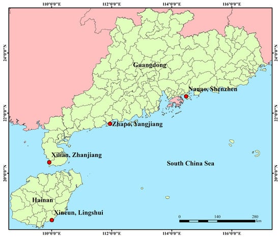 Map showing the sampling locations of the four cultured P. teira populations in this study. NA: Nanao, Guangdong; ZP: Zhapo, Guangdong; XL: Xilian, Guangdong; XC: Xincun, Hainan.