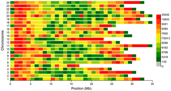 The genetic information of P. teira. The identification of high-quality SNPs and their distribution across 24 chromosomes of P. teira. The gradient colors from green to red indicate an increase in SNP density.