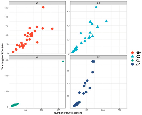 As shown in Table 4, NA exhibited the highest total number of ROH (3522), significantly more than ZP (1900), XC (2000), and XL (1264). All populations showed the highest proportion of short ROH (0.1–0.3 Mb; 68.3–84.3%), with XL displaying the greatest predominance of short ROH (84.3%). Notably, NA had a significantly higher proportion of long ROH segments (>0.6 Mb; 14.1%) compared to XC (6.1%) and XL (5.6%). Particularly striking was the >2 Mb ROH fraction in population NA (1.3%), while XC showed only 0.2%. These results suggest that population NA may have experienced more recent inbreeding events. The sum number of the ROH of segments and the total length of ROH in Mb per fish are shown in Figure 4. Most individuals in NA had the highest number and longest length of ROH. In contrast, the lowest number of ROH and shortest length of ROH were observed in individuals of XL.
