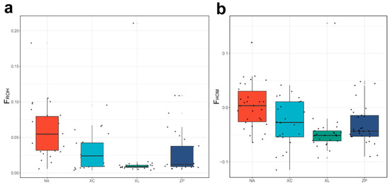 FROH values varied from 0.0172 to 0.0594 (Table 3), with the NA population showing the highest inbreeding levels and the XL population exhibiting the lowest. Consistent with these results, FHOM values followed a similar pattern across the analyzed populations (Figure 5).