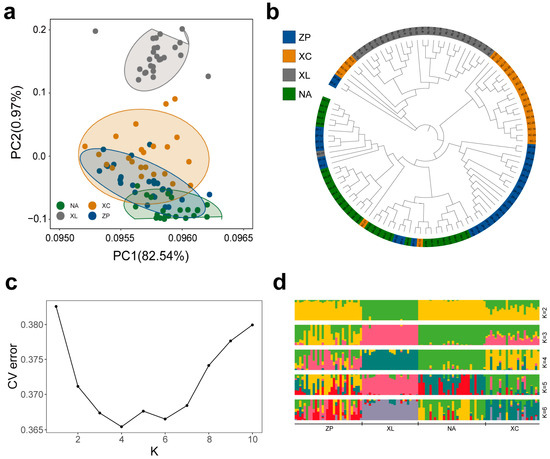 To evaluate the degree of genetic difference between populations, fixation index (FST) values and genetic distances were estimated (Table 5). The highest divergence was observed between XL and NA (FST = 0.065) and the lowest between ZP and XC (FST = 0.021). PCA results (Figure 6a) show that ZP, XC, and NA were divided into three clusters with overlap. The XL distribution appears independent. In the phylogenetic tree (Figure 6b), individuals from the XC, ZP, and NA populations were extensively intermingled, forming a large cluster with poor bootstrap support at internal nodes. This pattern, indicative of high genetic similarity and recent shared ancestry, aligns with our field surveys confirming that ZP and NA initially sourced their broodstock from the XC population. Conversely, the XL population formed a distinct, well-supported monophyletic clade, confirming its independent genetic lineage. This genetic divergence was corroborated by the PCA, where XL formed a separate cluster along PC1. The Delta K results indicated that the optimal number of genetic clusters representing the most similar ancestral populations was at K = 4. The cross-validation error (CV error) reached its minimum at this value (Figure 6c), aligning with the phylogenetic tree analysis results. Moreover, the genetic structure inferred (Figure 6d) closely corresponded with the phylogenetic relationships and showed strong concordance with the clustering patterns observed in the PCA plot.