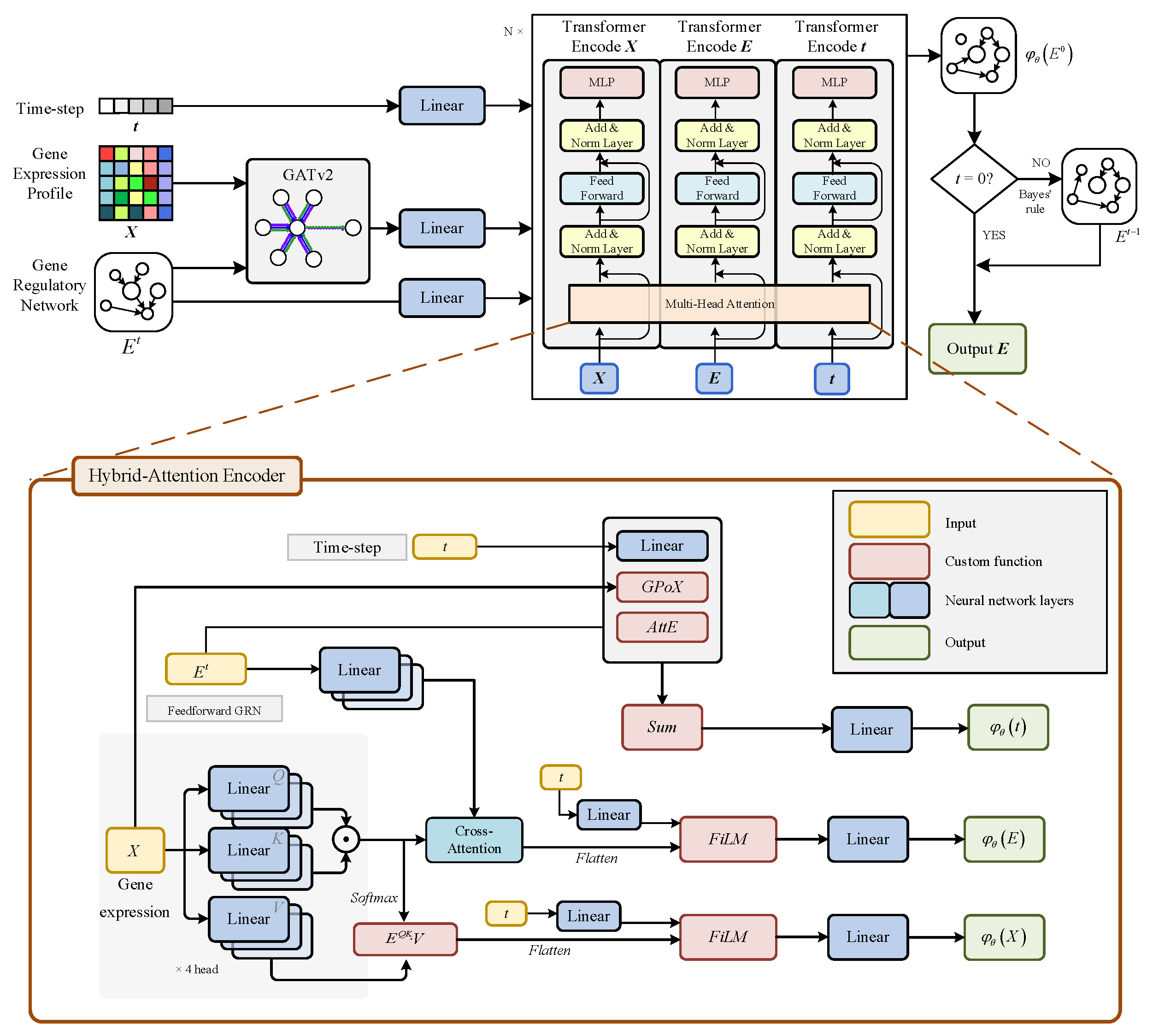 - Dynamic exploitation of time-step information. By means of time embeddings, it maps gene-expression and regulatory features into a shared temporal space: global structure is retained at high-noise steps, local details are emphasized at low-noise steps, and node- and edge-specific signals are fed back into the network structure, improving robustness and biological consistency.