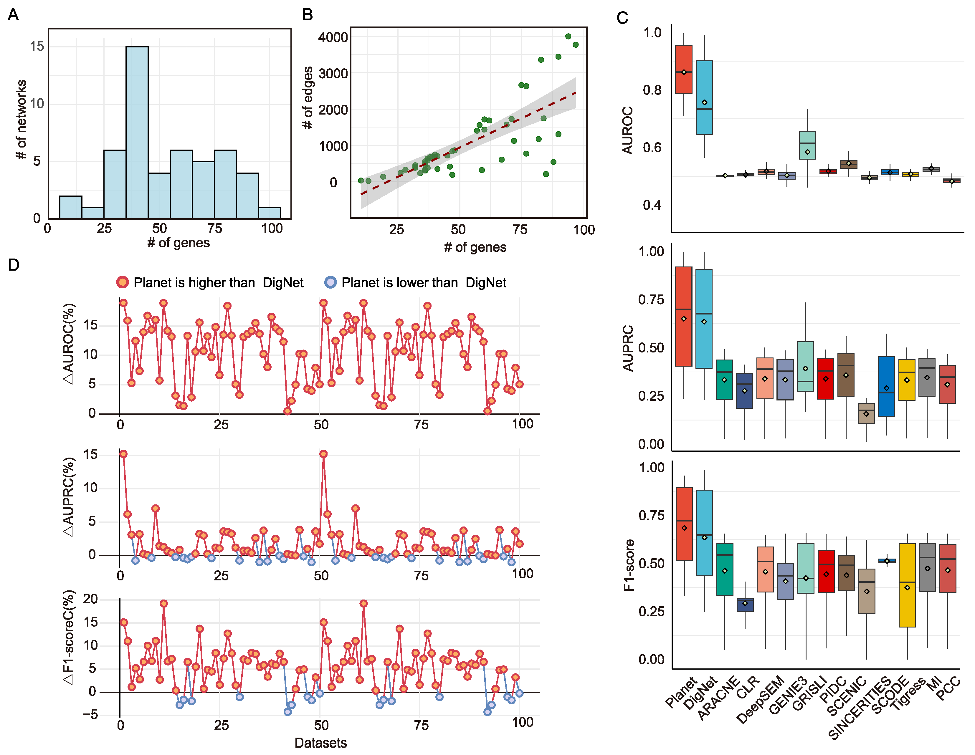 - Hybrid multi-level attention for complex regulation modeling. Planet integrates graph attention for structure-aware local aggregation, cross-attention for preserving global regulatory architecture across diffusion steps, and multi-head self-attention for capturing long-range dependencies. Together, these preserve high-confidence edges, enable structure-guided feature aggregation, and dynamically modulate information across diffusion steps, allowing stable modeling of complex network under high noise and sparsity.