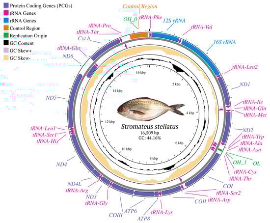 This study details the genome structure, codon usage, nucleotide composition, and gene order of the mitogenome of S. stellatus. To place these findings in context, these features were compared with those of other complete mitogenomes from the family and the suborder Stromateoidei to assess phylogenetic relationships among taxa. This also represents the first mitogenome reported for this genus. As a result, our molecular characterization can serve as a reference for species determination, providing genetic resources for taxonomic, systematic, and genetic research within Stromateidae.