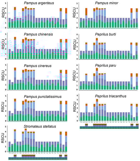 The overall codon usage and RSCU for all 13 PCGs in the S. stellatus mitogenome, three species of Peprilus, and five species of Pampus are presented in Figure 2. The total number of codons ranges from 3808 (P. chinensis, P. punctatissimus) to 3811 (P. paru), including the translation termination codons TAA and TAG, and the alternative stop codons AGA and AGG (Table S3). Comparative RSCU analysis among stromateids indicated that among all 13 PCGs, the codon usage was found to be conserved, with CUU (Leu1), CGA (Arg), and AAA (Lys) representing the most frequently used codons.