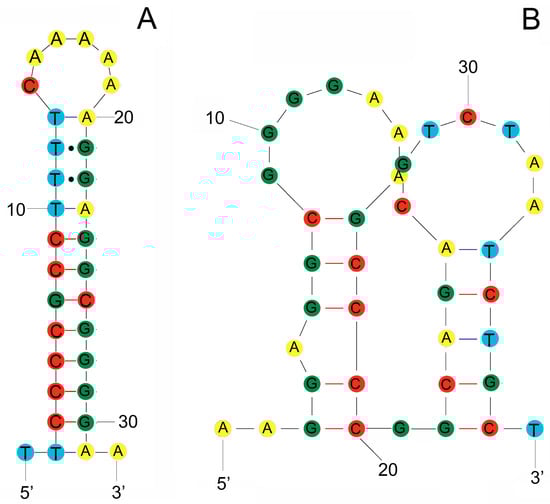 - Zuker, M. Mfold web server for nucleic acid folding and hybridization prediction. Nucleic Acids Res. 2003, 31, 3406–3415. [Google Scholar] [CrossRef]