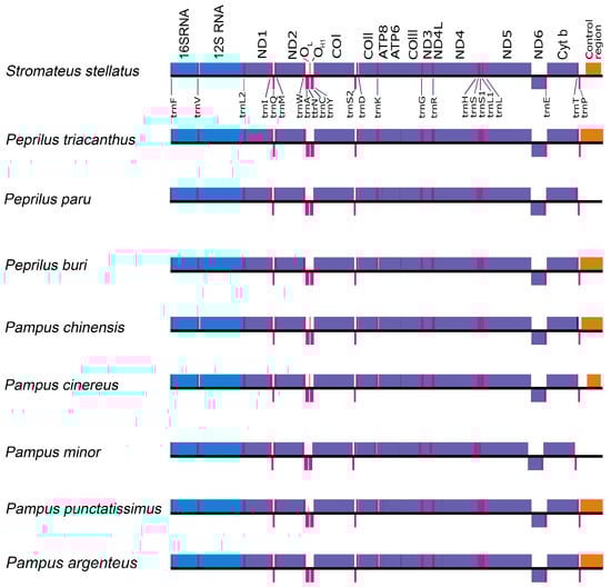 Comparative mitogenome organization of S. stellatus and eight Stromateidae species. The colors show what is indicated in Figure 1.