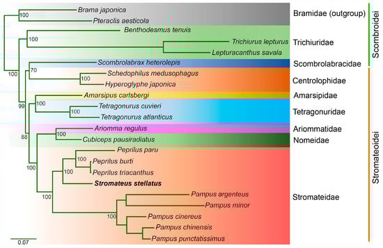 Phylogenetic analyses were conducted on a concatenated dataset of 13 PCG sites. This dataset contained 11,547 nucleotide-aligned sites, of which 5198 were parsimony-informative, 1016 were singletons, and 5333 constant sites. Both analyses, maximum likelihood (Figure 5) and Bayesian Inference (Figure S2), strongly support S. stellatus as the sister taxon to species of the genus Peprilus. Along with Pampus, these taxa form a well-supported clade, confirming the monophyly of the family Stromateidae. The families Ariommatidae and Nomeidae are identified as close relatives within the Stromateidae clade. Additionally, the families Amarsipidae, Tetragonuridae, Ariommatidae, Nomeidae, and Stromateidae together form a relatively well-supported clade, endorsing the monophyly of the suborder Stromateoidei. Notably, the family Scombrolabracidae, currently classified within suborder Scombroidei, was placed with relatively good support in a clade alongside Centrolophidae within suborder Stromateoidei.