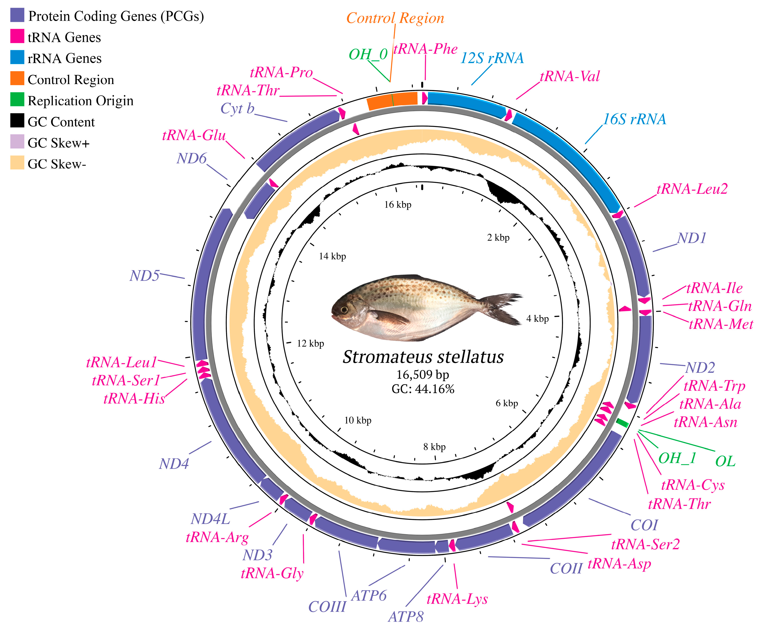 Angulo FE, Pedrero-Pacheco R, Nuñez JJ. The Complete Mitochondrial Genome of Stromateus stellatus (Scombriformes: Stromateidae): Organization, Gene Arrangement, and Phylogenetic Position Within the Suborder Stromateoidei. Genes. 2025; 16(11):1256. https://doi.org/10.3390/genes16111256