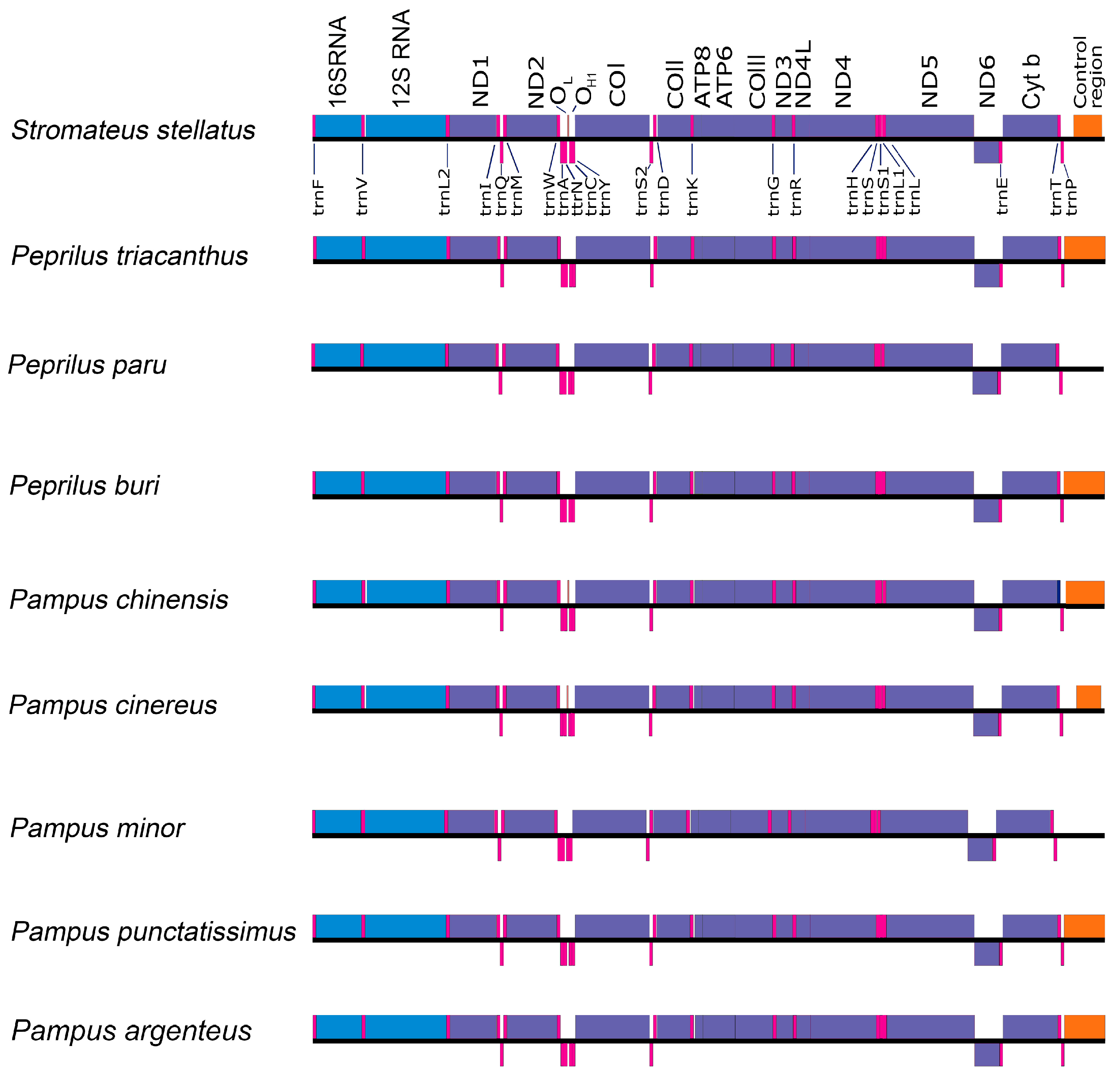 - Wang, S.; Zhao, L.; Li, Y.; Zhang, Z.; Wang, Z.; Gao, T. The complete mitochondrial genome of Pampus minor (Liu & Li, 1998) (Perciformes: Stromateidae). Mitochondrial DNA Part B 2019, 4, 205–206. [Google Scholar] [CrossRef]