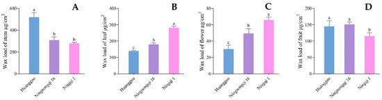 Wax load on above-ground organs of three goji varieties. Note: (A) is the wax load of stems; (B) is the wax load of leaves; (C) is the wax load of flowers; (D) is the wax load of young fruit. The letters above bars represents the differences between data. The same letters indicate non-significant differences, while different letters indicate significant differences.