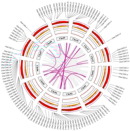 To investigate gene duplication events, intragenomic synteny analysis of the CER gene family was performed. The results revealed 23 syntenic gene pairs within the goji CER gene family. Specifically, chr6, chr7, chr11, and chr12 had one syntenic gene pair; chr2, chr3, and chr9 had two syntenic gene pairs; chr1 had three syntenic gene pairs; chr4 and chr5 had five syntenic gene pairs; and chr8 and chr10 had no syntenic gene pairs (Figure 3).