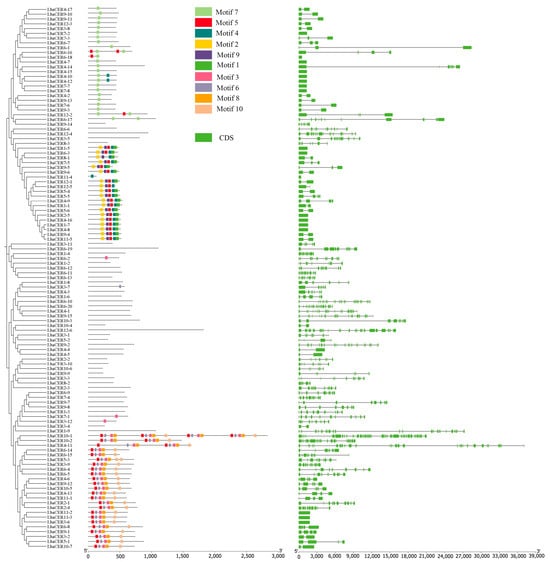 As shown in Figure 4, 10 conserved motifs were identified in goji CER proteins. Among these, Motif5 and Motif7 showed relatively widespread distribution, present in 46 and 27 proteins, respectively. Motif1 was found in only 18 proteins, representing the smallest distribution. From specific observations, 23 CER proteins possessed 1 motif and 4 CER proteins had 2 motifs, among which LbaCER10-1 contained 18 motifs, while the remaining proteins contained 3-9 motifs. However, 41 CER proteins lacked any motifs, suggesting that the goji CER genes may have experienced loss or acquisition of conserved motifs during evolution, potentially indicating the emergence of novel functions in evolutionary process.